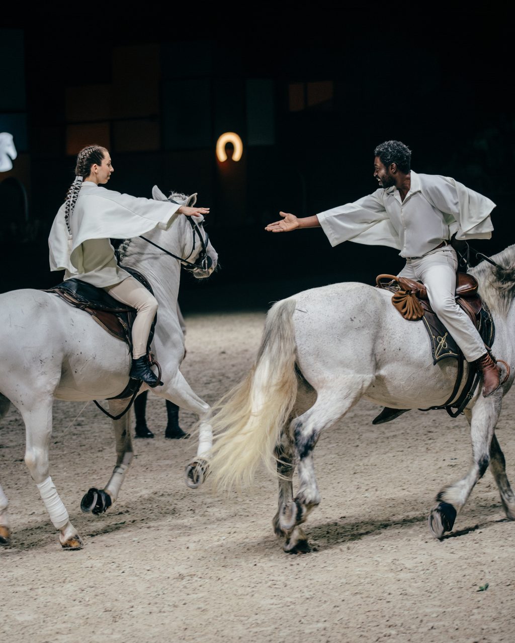 Final result is a performance where animals, performers, riders, and costume echo one another. To tame each other, and finally, embrace